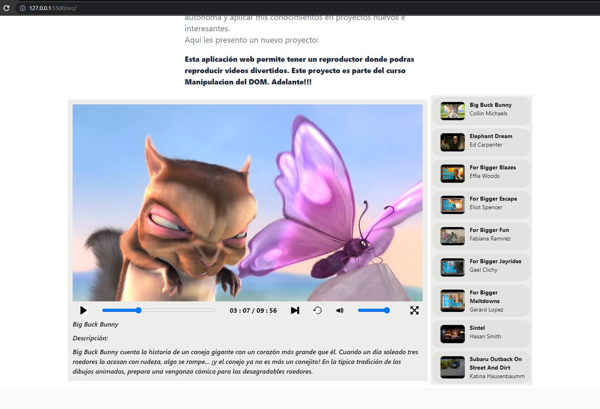 Esta app web trae diferentes videos para poder reproducirlos y a la vez poder manipular el dom, para usar play, pause, reinicio, control de volumen y siguiente y ver una lista de videos.